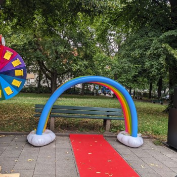Auf der Festwiese sind die evangelischen und katholischen Gemeinden aus Neuhausen-Nymphenburg unter dem Regenbogen versammelt zur persönlichen Segnung, zu Gesprächen.